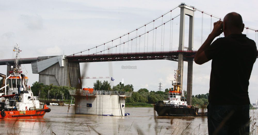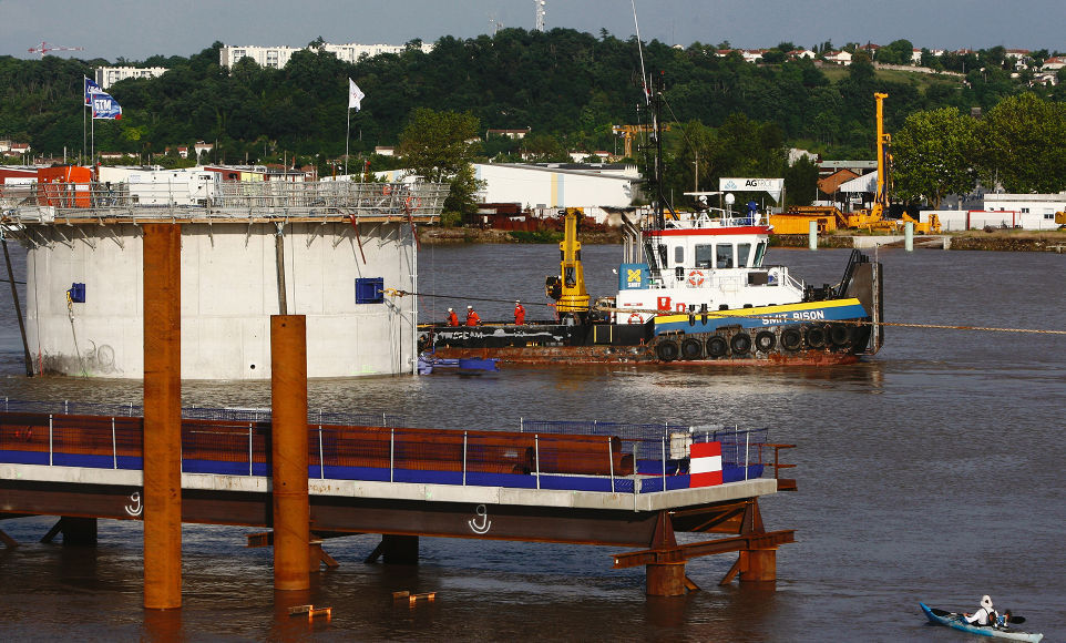 Plusieurs centaines d’habitants de l’agglomération se sont rendus hier sur les quais pour accueillir le premier îlot du futur pont Bacalan-Bastide. Cette première base en ciment, de 15 m de haut, de 18 m de diamètre et de 2 000 tonnes est destinée à protéger les futures fondations des piles du pont.