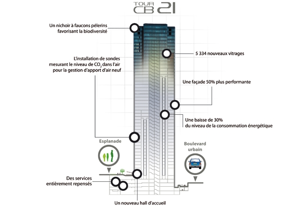 L’architecture d’intérieur reprend l’esprit « Grand Hôtel New-Yorkais ». La tour qui se veut également écologique est la première en France à recevoir la certification Breeam, label anglais certifiant la qualité énergétique de bureaux. Le niveau de consommation énergétique a ainsi été réduit de 30 % et la façade entièrement refaite, soit 50 % de gain de performance. Outre ce label, la tour est également parée de la certification HQE Exploitation. Toujours dans une optique écologique, la tour est dotée de sondes CO² mais également d’un nichoir à faucons et d’un système de tri des déchets.