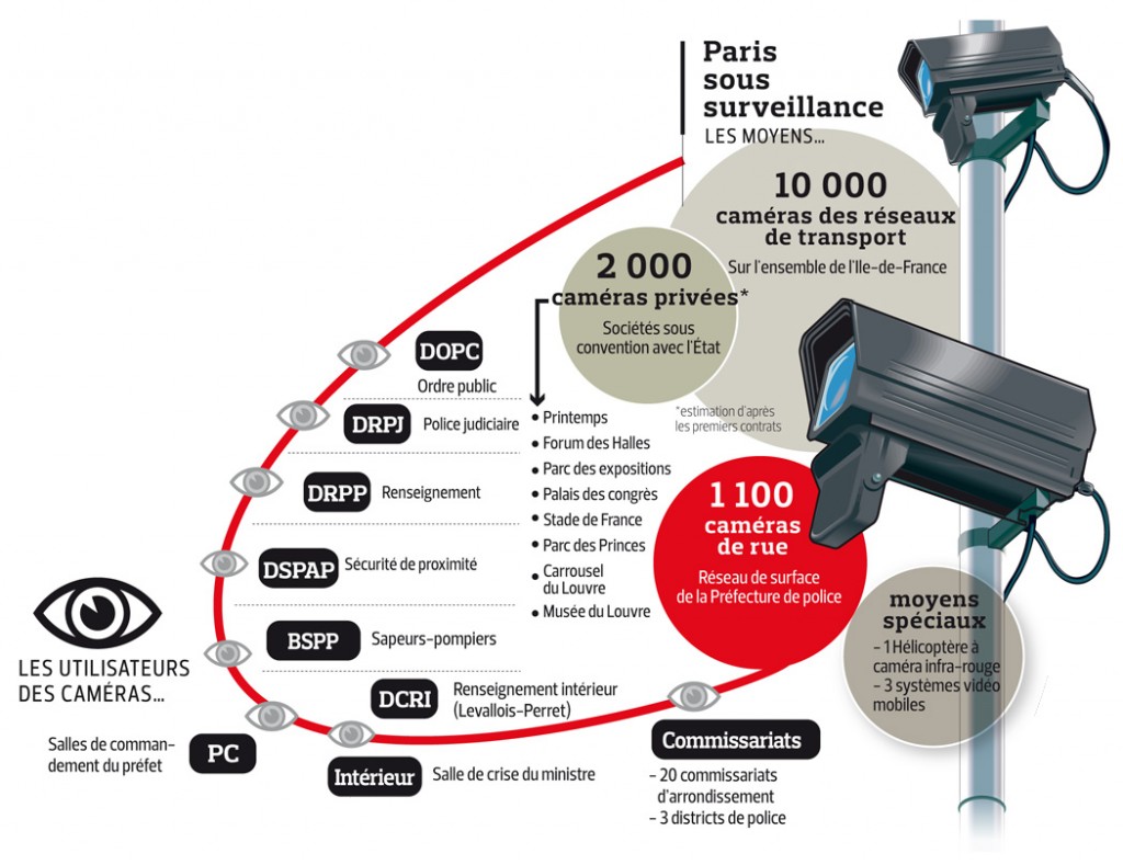 Outre les 1 000 caméras de vidéosurveillance installées pour l’occasion, c’est également les 10 000 caméras mises en place par la SNCF et la RATP dans les transports urbains, bus, métro et RER ainsi que 2 000 caméras privées (Forum des Halles, Stade de France, Printemps, Musée du Louvre etc.) qui seront accessible par certains policiers habilités, grâce à un simple clic.