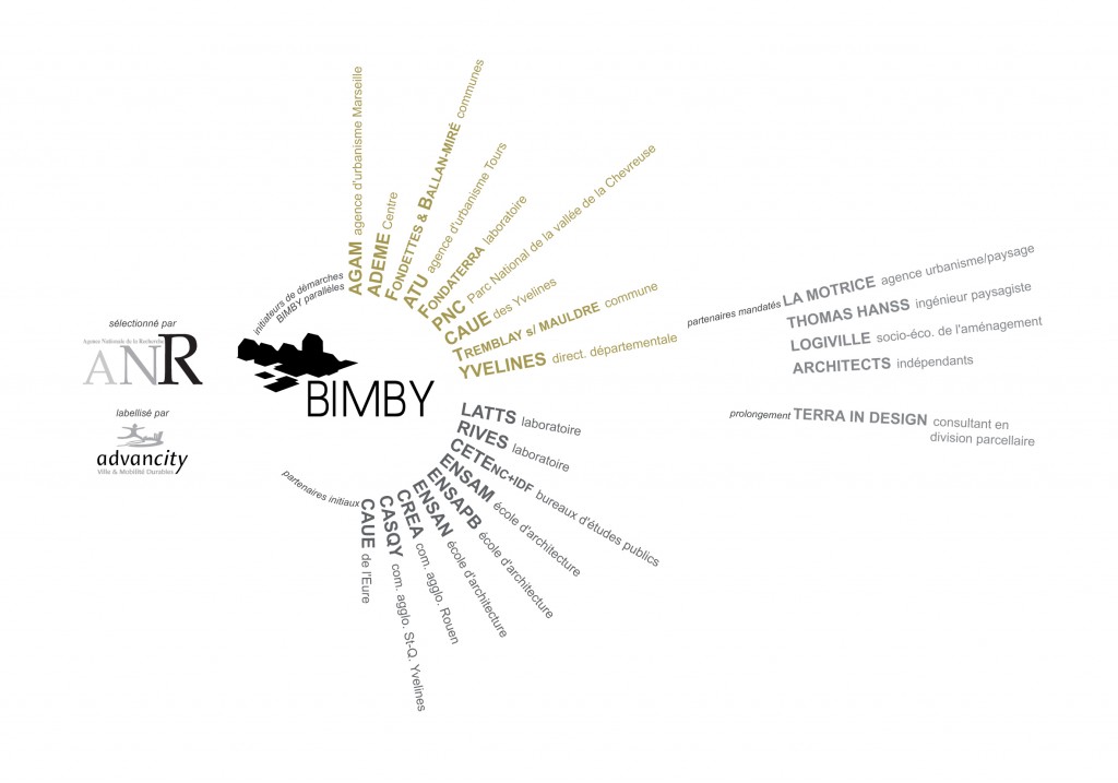BIMBY ne rassemble aucun acteur privé. Le premier casting, celui qui lui a permis d’être sélectionné par l’appel à projet Villes Durables 2009 lancé par l’Agence Nationale de la Recherche (ANR), rassemble milieu universitaire (laboratoires et écoles d’architecture), collectivités publiques (Saint-Quentin-en-Yvelines CASQY, Rouen-CREA, CAUE de l’Eure) et bureaux d’étude publics (CETE Normandie, CETE Île-de-France). Aucun constructeur, promoteur ou lotisseur à l’horizon. En effet, en plaçant la maison individuelle comme une des clés de voûte du développement urbain, BIMBY donnent les pleins pouvoirs aux constructeurs, mais assèche les lotisseurs, leurs mères nourricières. Les lobbyistes préfèrent leurs alliances, tout en soutenant poliment le projet. Le petit BIMBY peut grandir sans eux.