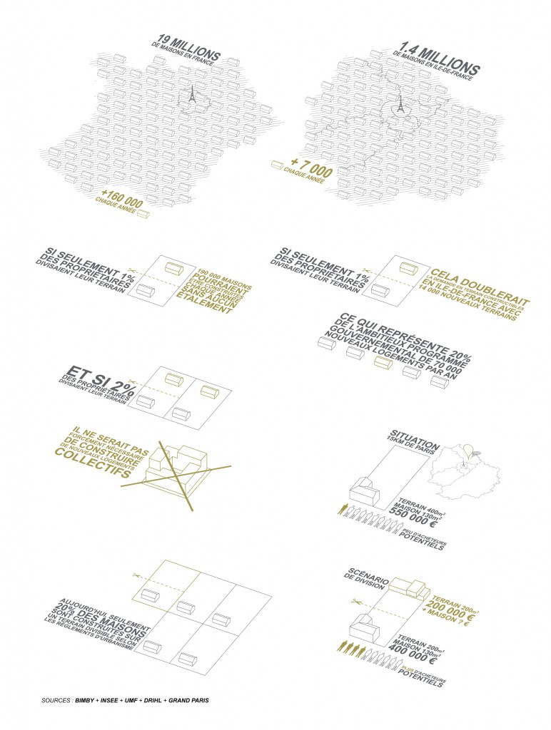 Hormis des intérêts locaux engendrés par ces mécanismes, un changement de cadrage s’impose. La France compte aujourd’hui 19 millions de maisons individuelles, et environ 160 000 nouvelles sont implantées chaque année. Si seulement un petit pourcent de ces propriétaires décidaient de diviser leur terrain pour permettre d’accueillir une nouvelle construction, alors ces nouvelles maisons n’engendreraient plus aucun étalement urbain. Angoisse des lotisseurs, dont c’est le fond de commerce. L’offre que pourrait générer ce 1% peut même aller jusqu’à dépasser la demande. L’enjeu est de taille, la micro et la macro-économie, l’opération architecturale et la planification territoriale se croisent, se collisionnent, se complémentent. C’est un nouvel état d’équilibre qu’est capable de générer la filière BIMBY à grande échelle. Et les raisons sont bonnes de croire en une généralisation du phénomène.