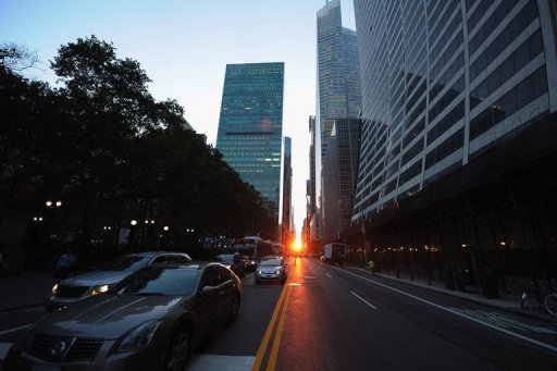 C’est un phénomène assez rare qui s’est produit mardi soir, au cœur de la « Big Apple » : aux dernières lueurs de la journée, les rayons du soleils, parfaitement alignés sur le tracé des rues, selon un axe est-ouest, ont illuminé le bitume et les façades des gratte-ciel new-yorkais.