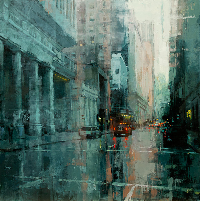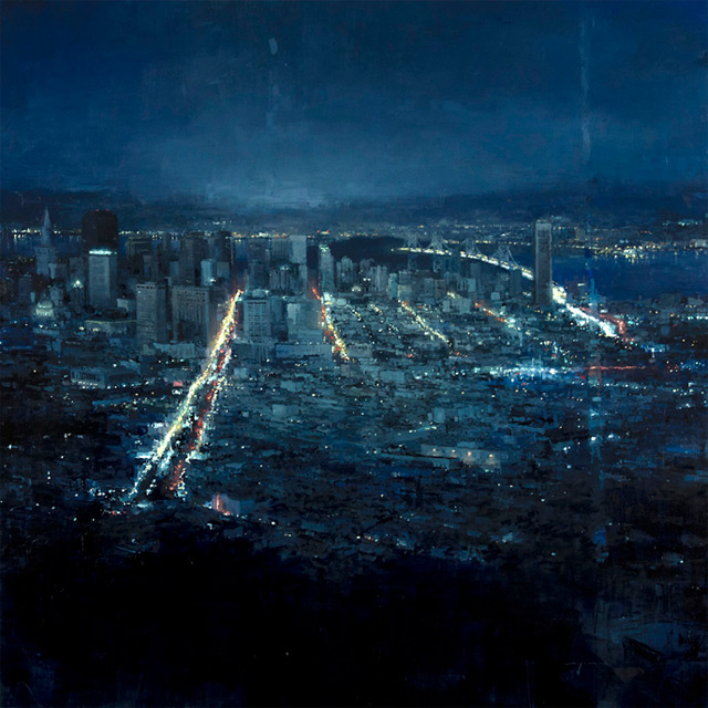 Né en 1979, Jeremy Mann est diplômé de l’Université d’Ohio et également titulaire d’une maîtrise de l’Academy of Art University de San Francisco. C’est de la ville de San Francisco où il vit encore aujourd’hui dont il tire toute son inspiration. Un certain nombre de ses compositions sont par exemple inspirées par la chaussée de la cité californienne et plus précisément par la réverbération des lampadaires et autres enseignes lumineuses sous la pluie. Ce qui frappe au premier abord, c’est le réalisme de ces représentations inédites, l’immersion y est totale.