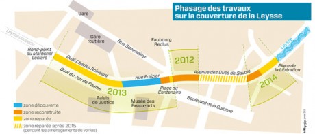Ces travaux comptent en réalité trois opérations distinctes. La première, la plus emblématique, est la « redécouverte » de la Leysse sur 125 mètres. Pour enlever la couverture de béton, un portique de 10 mètres de haut et de 21 mètres de portée est déjà installé et va permettre de charrier des blocs de 60 tonnes. La seconde opération est le remplacement d’une partie de la couverture, l’ensemble du cours d’eau n’étant pas destiné à être découvert. Enfin, un dernier tronçon se verra renforcé par des fibres de carbones afin de pouvoir soutenir le futur centre d’échanges des bus de la ville.