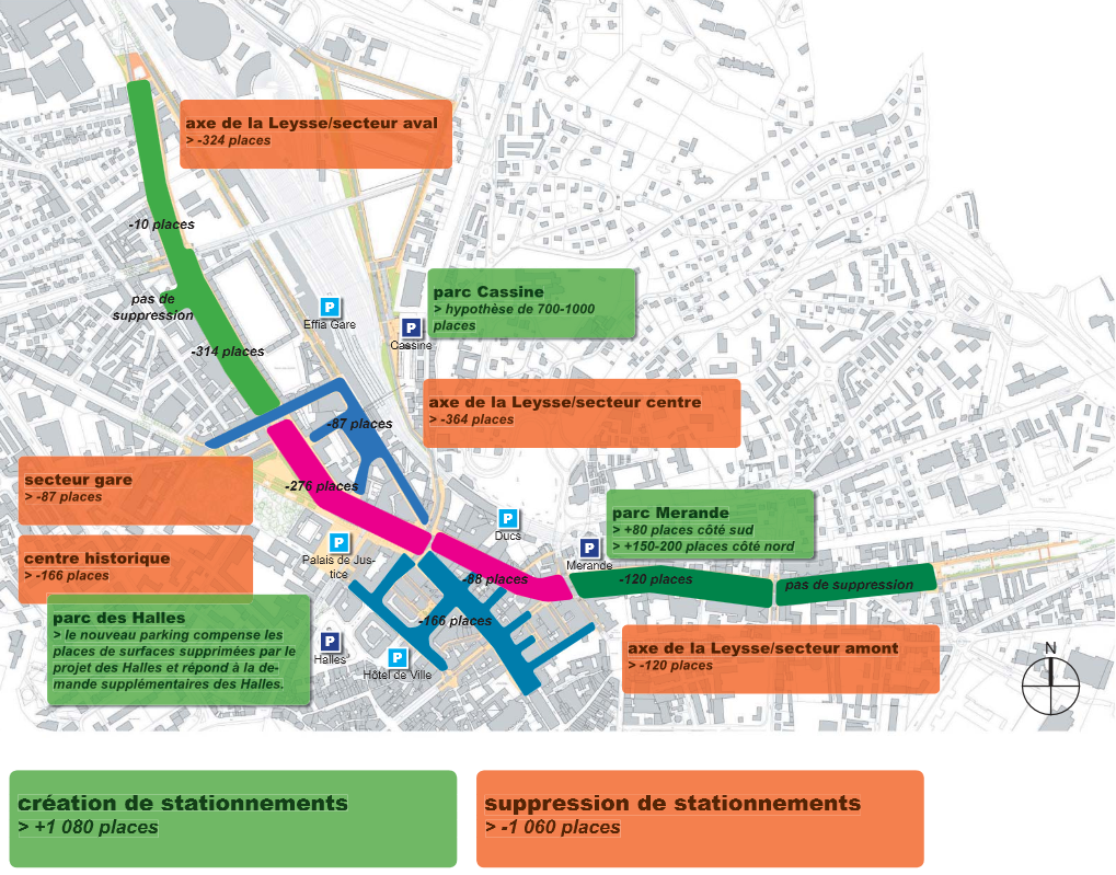En donnant la priorité aux bus (nouvelles voies réservées, nouveau centre d’échanges), en augmentant la surface des zones piétonnes et en déplaçant un certain nombre de places de parkings centraux vers de nouvelles zones excentrées, le projet prend le pari de permettre aux pendulaires de se garer en périphérie afin de soulager les stationnements des résidents dans l’hypercentre. Une diminution de 25% de la circulation sur l’axe de la Leysse est ainsi espérée, ce qui représente une diminution de 8000 véhicules par jour. Interrogé sur la possibilité de consentir à des « sacrifices » pour concrétiser son projet, Paul Chemetov a ainsi répondu « il n’y a pas de jeu à somme nulle ». Selon lui, l’essence du projet est de renverser la situation existante, présentant un rapport de 2/3 pour le goudron et de seulement 1/3 pour la nature et les modes doux.