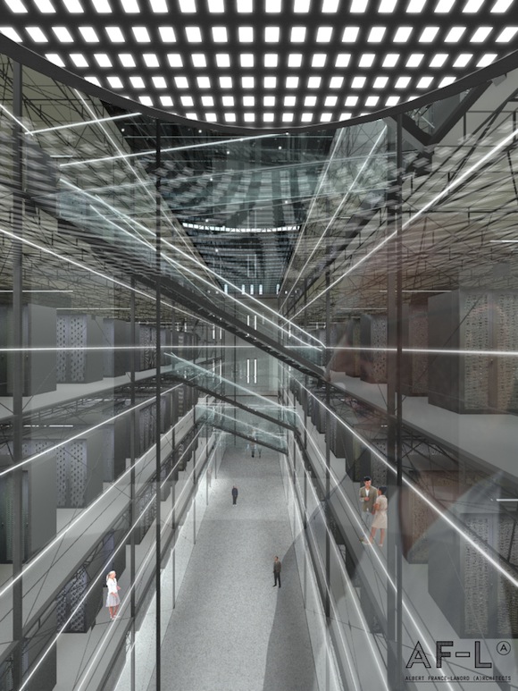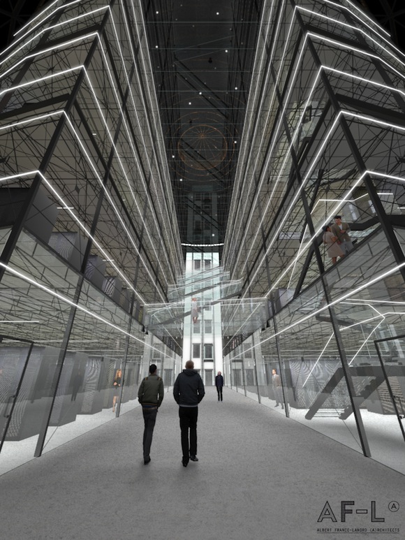 - Les murs de verre, et le vide sur toute la hauteur permettent de mettre en valeur l’architecture de de l’ancien bâtiment. Crédits photo : AF-L