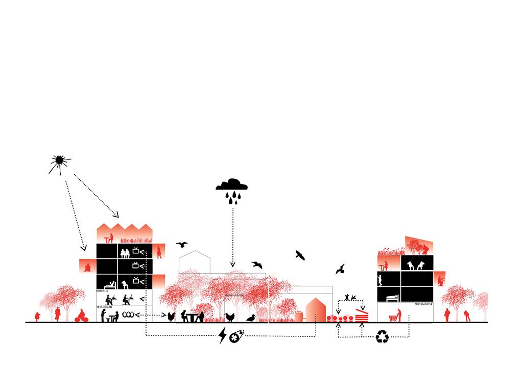 - Les unités de voisinage mixtes offrent une grande variété de moyens de productions énergétiques. Tout est sujet à échange, à récupération d’énergie, à transformation; rien ne se perd, tout se transforme : chaleur basse température de process, déchets transformables, énergies dégradés, eaux usées… Tout devient utilisable pour une autre activité. Les consommateurs et producteurs peuvent s’inverser et leurs rapprochements permettent de développer de nouveaux usages et de nouvelles solidarités. Crédits photo : AIGP / Brès + Mariolle et chercheurs associés
