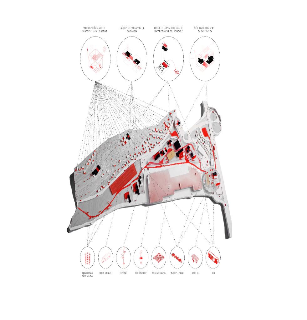 - Fragment de projet montrant les volumes météorologiques en rouge. Crédits photo : AIGP / Brès + Mariolle et chercheurs associés