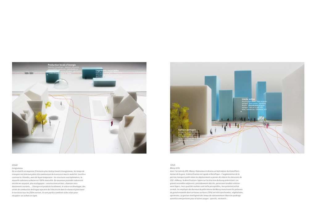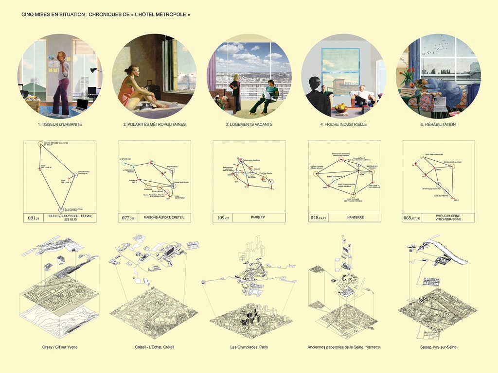 - L’Hôtel Métropole appliqué. Cinq mises en situation dans le Grand Paris : tisseur d’urbanité : Orsay/ Gif sur Yvette ; renforcer les polarités métropolitaines : Créteil – L’Echat ; logements vacants : les Olympiades, Paris ; friche industrielle : anciennes papeteries de la Seine, Nanterre ; Réhabilitation : Sagep, Ivry- Sur-Seine. Crédits photo : AIGP / DPA, Dominique Perrault architecture
