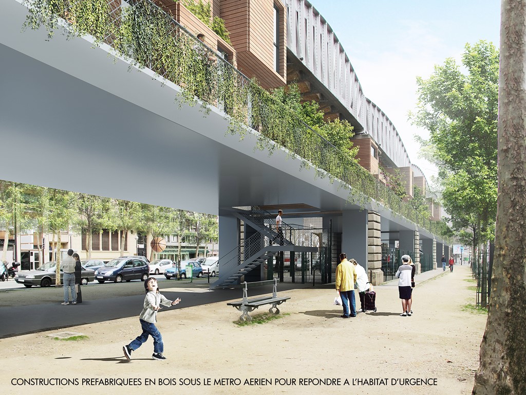 - Constructions préfabriquées en bois sous le métro aérien pour répondre à l’habitat d’urgence. Crédits photos : AIGP / Agence Elisabeth et Christian de Portzamparc