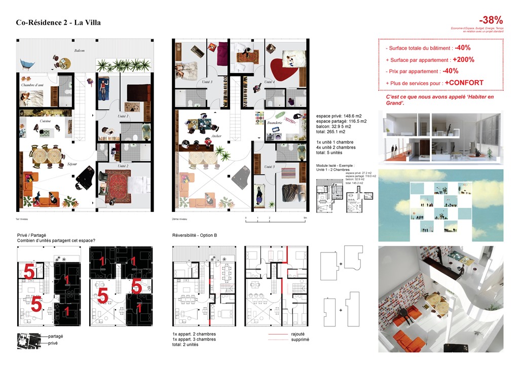 - Co-Résidence n°2 : La Villa. Cette Co-Résidence en duplex génère 40 % d’économie par rapport à des appartements standards. Elle accueille une petite communauté de 5 unités, chacune avec des espaces privés (chambres et salles de bains) et une grande cuisine et un salon en double-hauteur partagés. Le “partage” autorise l’addition de “fonctions luxueuses” comme un atelier, une buanderie ou une chambre d’ami, et le tout atteint une économie de 40%. Par exemple, la famille 1 bénéficie d’un appartement Co-Résidentiel de 145 m² (27 m² en propriété individuelle + 118 m² en propriété collective) – soit le double d’un appartement standard de 2 chambres – avec bien plus de services, tout en payant 40% de moins. Crédits photo : AIGP / STAR Stratégies + architecture