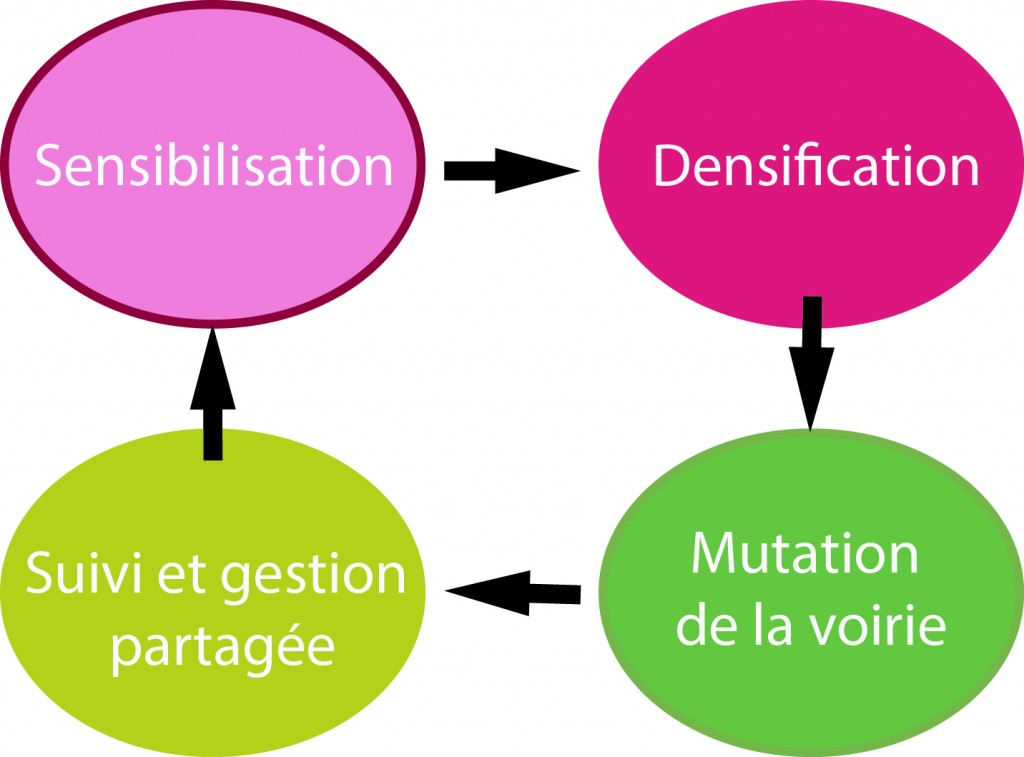 - Schéma d’un cycle possible de transformation des impasses périurbaines. Crédits : Urbanews