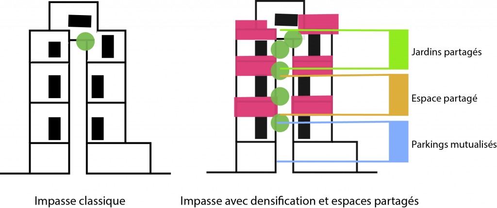 Dans un tel contexte qui verrait le pavillonnaire muter progressivement vers plus de densités, et les collectivités monter en charge sur la question, l’impasse aurait sans doute d’avantage de pertinence à ne plus subsister uniquement en tant que voie de desserte, mais également, à abriter et à mutualiser des fonctions de voisinage, comme le stationnement ou les espaces partagés de jardins ou de détente… Un glissement des usages, de la propriété vers le partage, qui ne va pas évidemment, sans se confronter à quelques limites, et parmi elles, celles que supposent les « tolérances de voisinage » semblent les plus difficiles à dépasser…