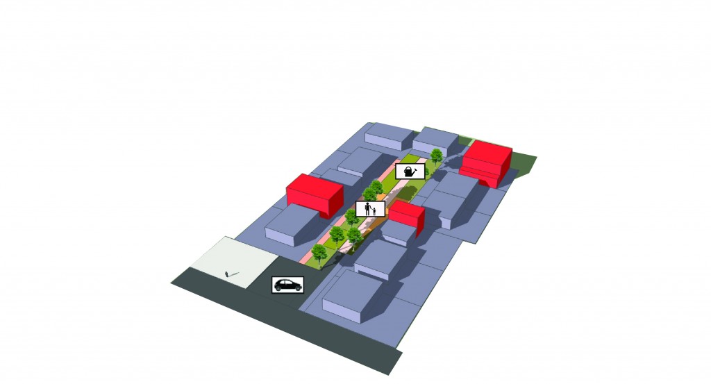 - Vue d’une impasse type après densification de type BIMBY (en rouge) et retrait de la voiture. Crédits : Urbanews