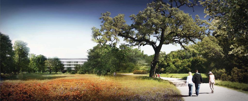 - Aménagements extérieurs du futur campus Apple à Cupertino. Crédits photo : Foster + Partners / ARUP / Kier + Wright / OLIN / Apple