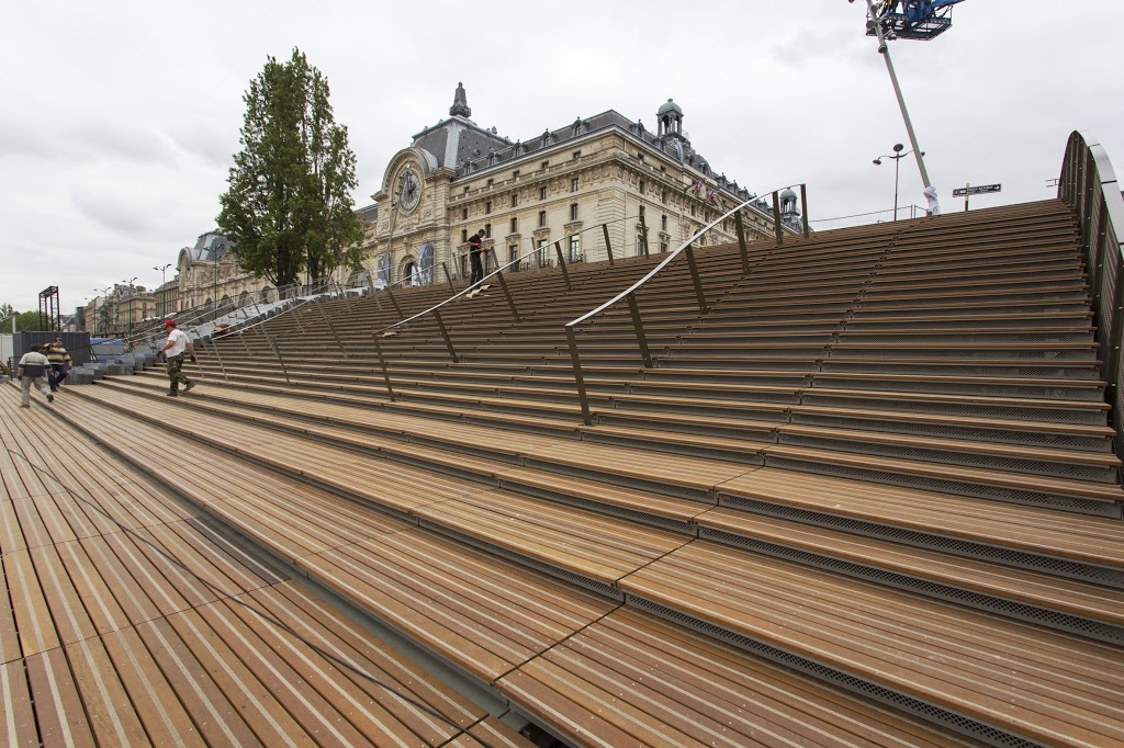 - Au pied du Musée d’Orsay, ont été installés des gradins en bois reliant les parties hautes et basses des berges et offrant un point de vue inédit sur le fleuve. Cet espace devrait également permettre d’assister à des spectacles joués sur la Seine. Ce qui devrait notamment être le cas pour la soirée d’inauguration de mercredi.