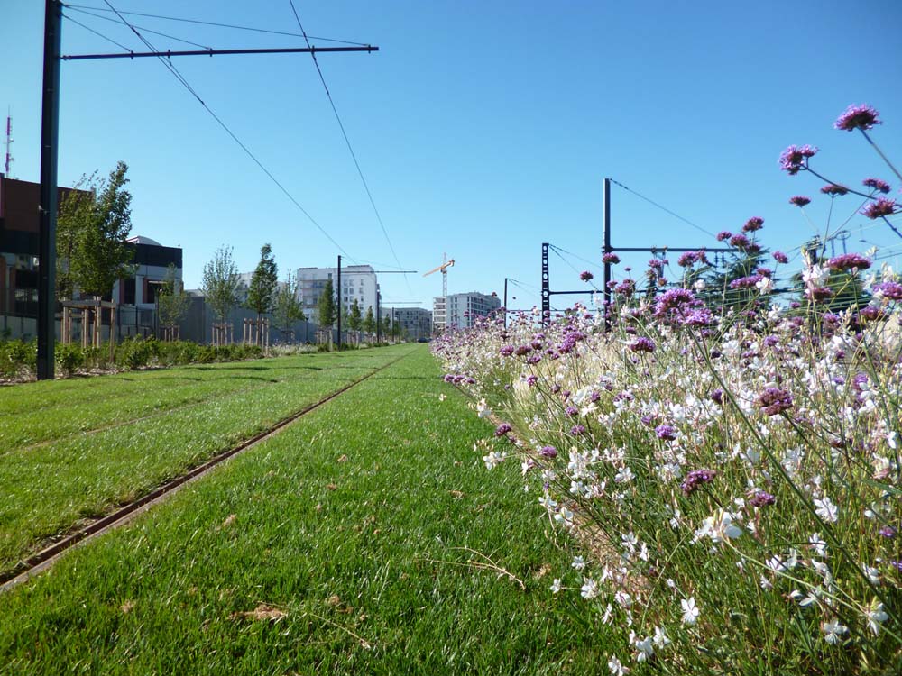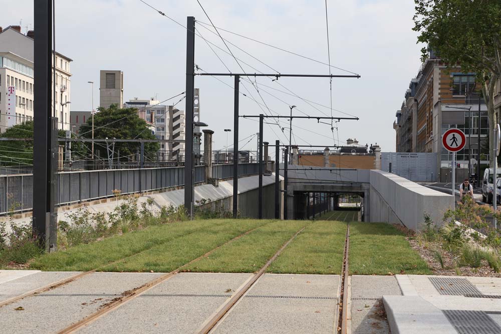 Outre sa longueur imposante, la « forte » identité végétale de la ligne T4 est également un signe distinctif. Le prolongement inauguré jeudi dernier affirme les principes de « nature urbaine » mis en œuvre sur la première phase du tracé. Ainsi, en fonction de l’environnement traversé par la ligne, son identité végétale peut s’exprimer par une végétalisation de la plateforme, la plantation d’alignements d’arbres spécifiques ou de plantes grimpantes complétant ponctuellement le tableau végétal au niveau des stations. Un travail à mettre au crédit des Paysagistes Lyonnais de l’Agence Ilex, qui se sont également penchés sur la mise en lumière du nouveau tronçon. L’image de ligne verte et fleurie est ainsi réinterprétée la nuit par des jeux de suggestions lumineuses du végétal…