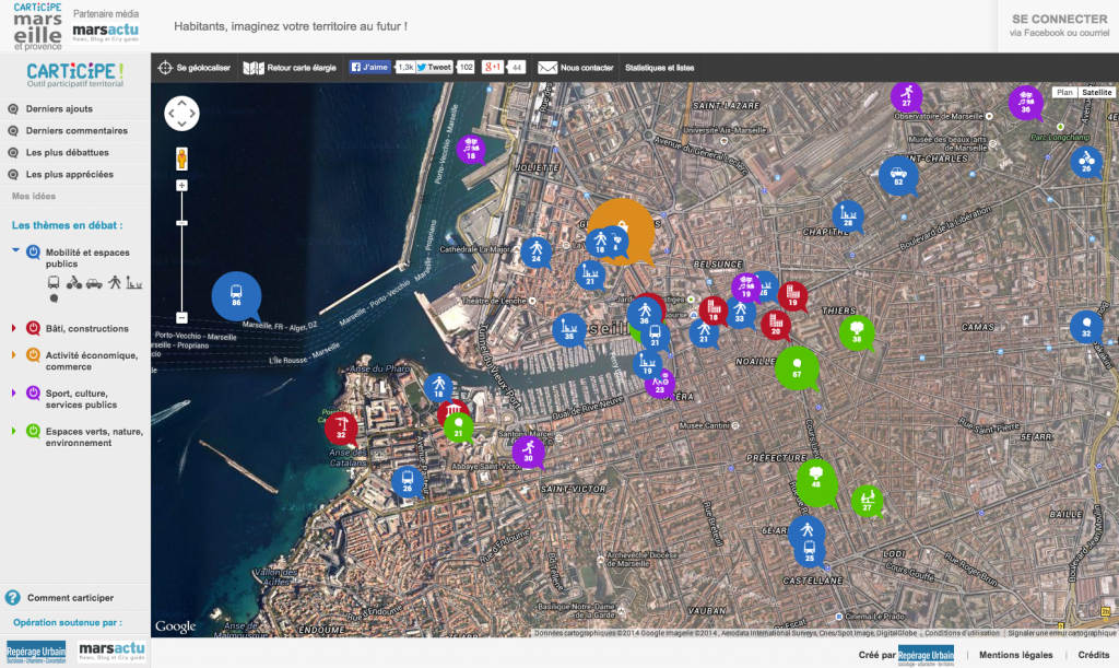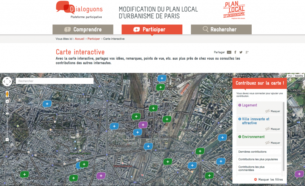 Ainsi, la participation citoyenne est de plus en plus ancrée dans les projets urbains, si bien qu’elle devient une étape nécessaire au processus de conception. On co-labore, au sens étymologique du mot, on travaille en union, en simultanéité. Et de cette union naissent de nouveaux outils, allant du brainstorming paperboard et post-it aux cartographies et applications numériques sophistiquées ; mettant en avant les expériences de l’usager comme véritable expertise du territoire. Rapidement, on peut citer les travaux de Repérage Urbain notamment pour leur outil de participation web citoyenne « Carticipe » à Strasbourg et Marseille ; ou l’initiative comparable de la Ville de Paris « imaginons.paris« , plateforme participative (voir aussi son fil d’actualité Twitter) en vu de la modification du PLU de Paris. Ces projets mériteraient d’ailleurs un billet consacré à part.