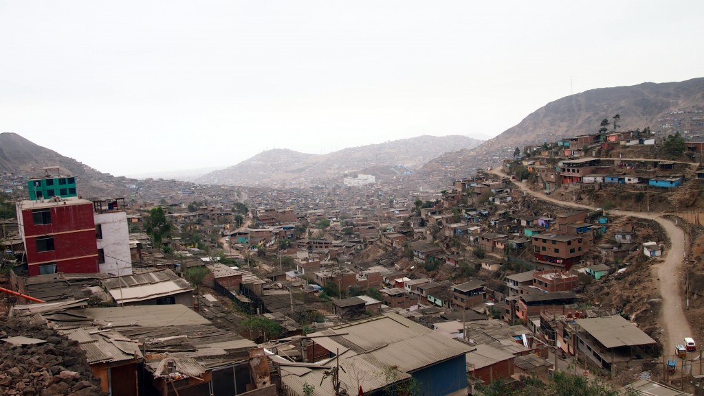- Quartier périphérique de Lima construit dans les hauteurs rocailleuses, sans accès à l’eau potable et menacé d’effondrements en cas de séisme important, Villa Maria del Triunfo, 2014.