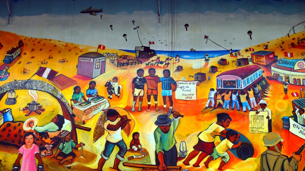- Peinture murale représentant l’organisation populaire à l’origine de la Communauté Urbaine Autogérée de Villa El Salvador, peuplée aujourd’hui de plus de 450.000 habitants, Lima, 2014.