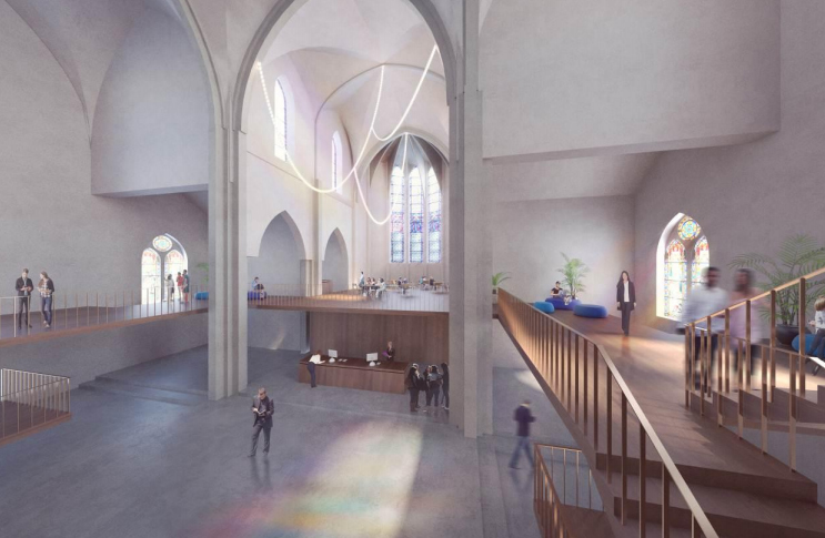 Côté architecture, le projet de centre d’affaires développé par l’équipe composée de Carré d’Or, Urban Project et des architectes des Agences Perraudin et ALEP est un juste équilibre entre création de nouveaux usages et restauration. Ainsi dans le respect de l’histoire du lieu et de ses caractéristiques, prendront place une succession d’espaces de bureaux privatifs (calmes, studieux, confidentiels et confortables), d’espaces de travail partagés (informels, conviviaux et collaboratifs), de salles de réunion, et de zones de détente et de convivialité. 30% de la surface totale est dédiée à des espaces communs ce qui devrait favoriser les interactions rencontres et échanges. Les plateaux de travail sur trois niveaux sont disposés de part et d’autre de la nef dans les chapelles latérales, selon un système de boîtes contemporaines en bois.