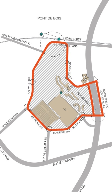 - un axe citoyen qui relie le quartier de l’Hôtel de Ville à celui du Pont de Bois, où se situe notamment l’Université de Lille 3, et à celui du Triolo, où l’on trouve l’une des piscines municipales ainsi que l’Université de Lille 1 en lisière du quartier ;
