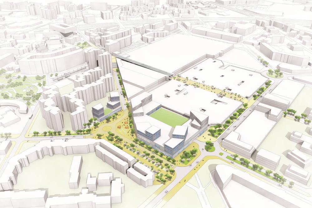 - la place commerciale. Au niveau de l’ancienne station service, une nouvelle offre commerciale pourra voir le jour avec la requalification de l’espace et une amélioration de ses connections avec la future place citoyenne et le pôle d’échanges (métro et bus). L’idée est également d’ouvrir le centre commercial sur la ville, avec la possibilité de le traverser à toutes heures depuis la place citoyenne jusqu’au Heron Parc (cinéma, restaurant, commerces, bureaux) ;